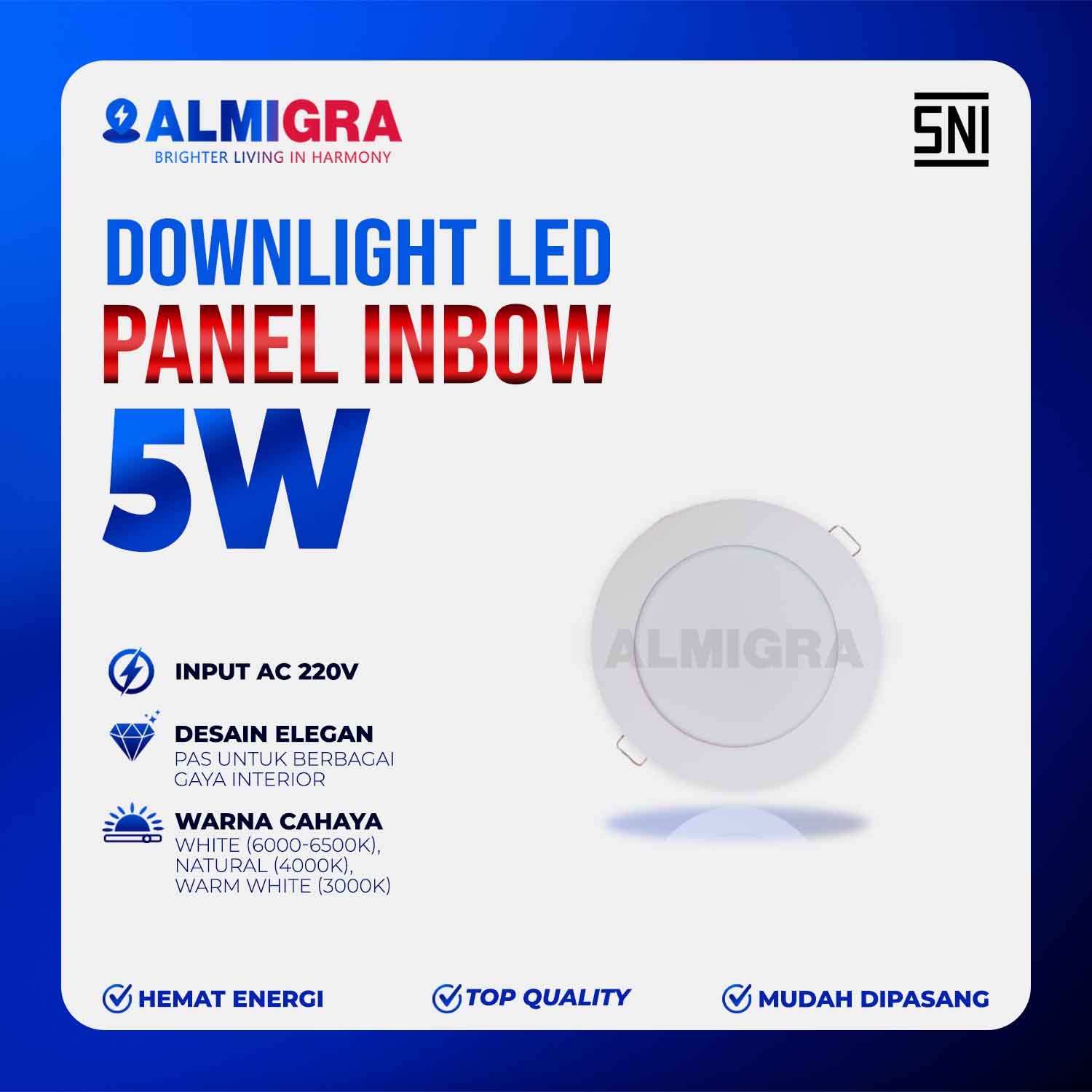 LED Downlight Panel Inbow memberikan pencahayaan efesien dengan konsumsi daya rendah hanya 5 watt, pilihan hemat energi dengan cahaya terang dan nyaman di mata. Cocok untuk ruangan kecil hingga menengah seperti kamar, lorong, dapur, area kerja, dan area ruangan lainnya. Pilihan tepat bagi Anda yang mengutamakan penerangan berkualitas, hemat listrik, dan tampilan interior lebih estetik.