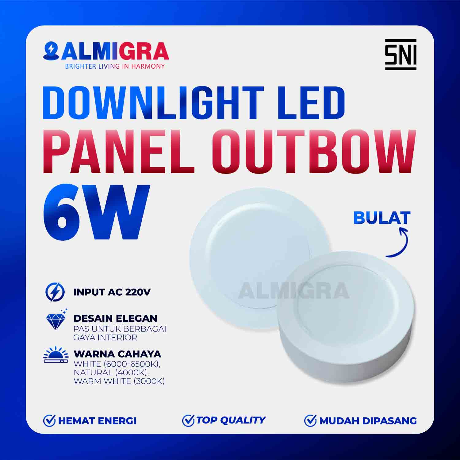 Percantik interior rumah atau kantor Anda dengan Downlight Panel LED Outbow Bulat. Desainnya yang minimalis modern dan teknologi LED terbaru menghadirkan cahaya terang, merata, sekaligus hemat energi. Jenis lampu plafon tempel ini tidak perlu melubangi plafon, cukup dipasang dengan sekrup/bor pada plafon gypsum, kayu, PVC, maupun dak beton. Desain timbul (outbow) membuat instalasi lebih praktis tanpa merusak plafon.