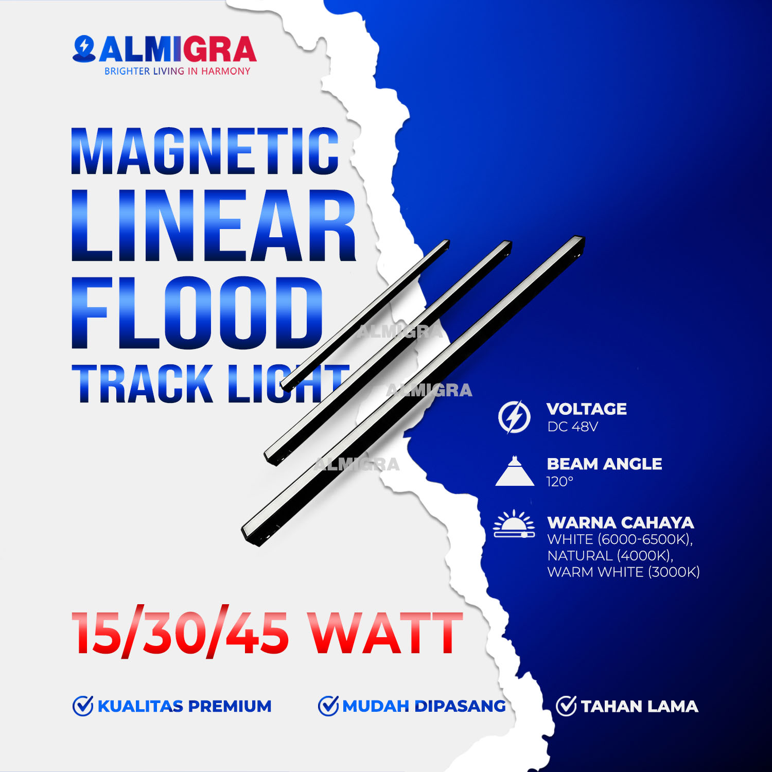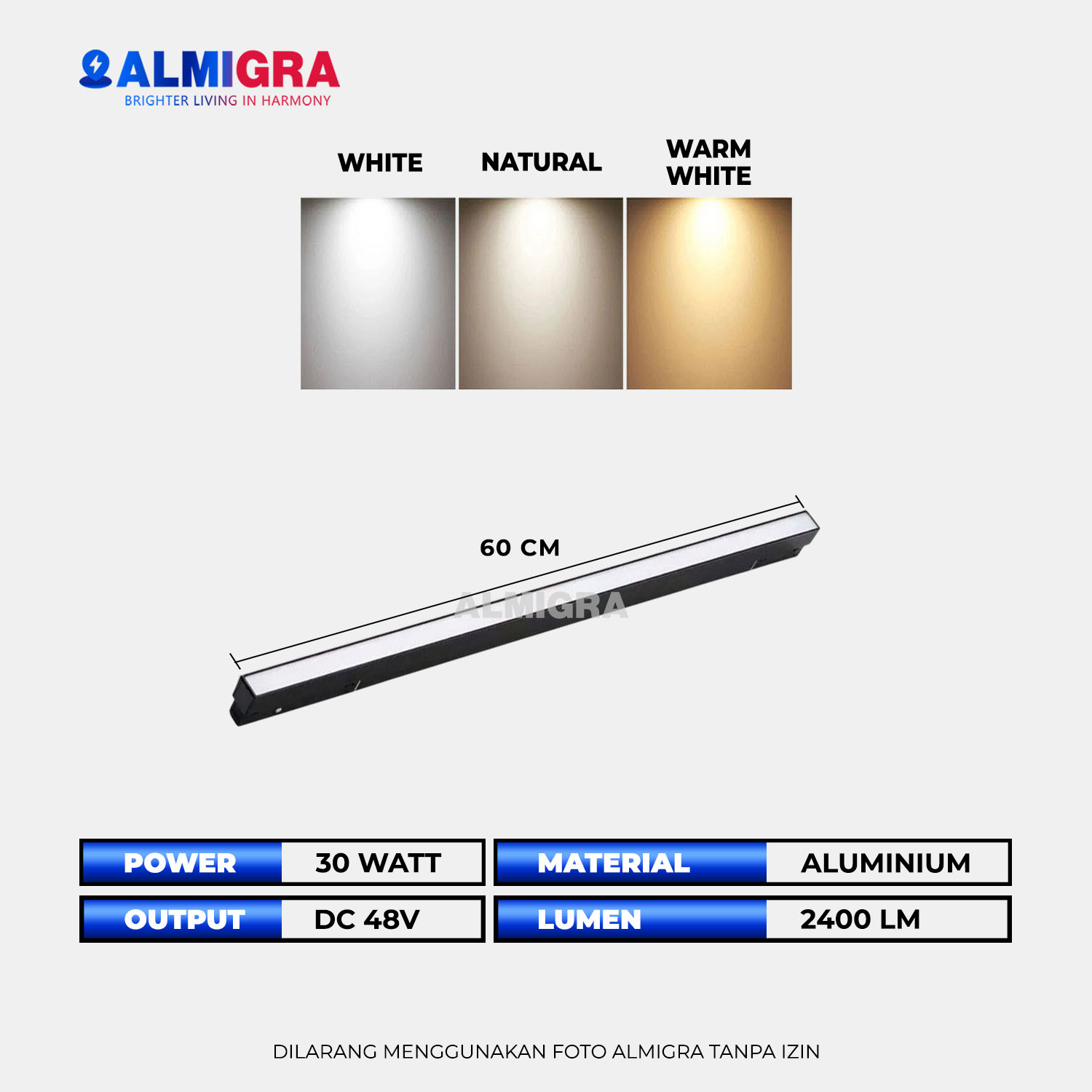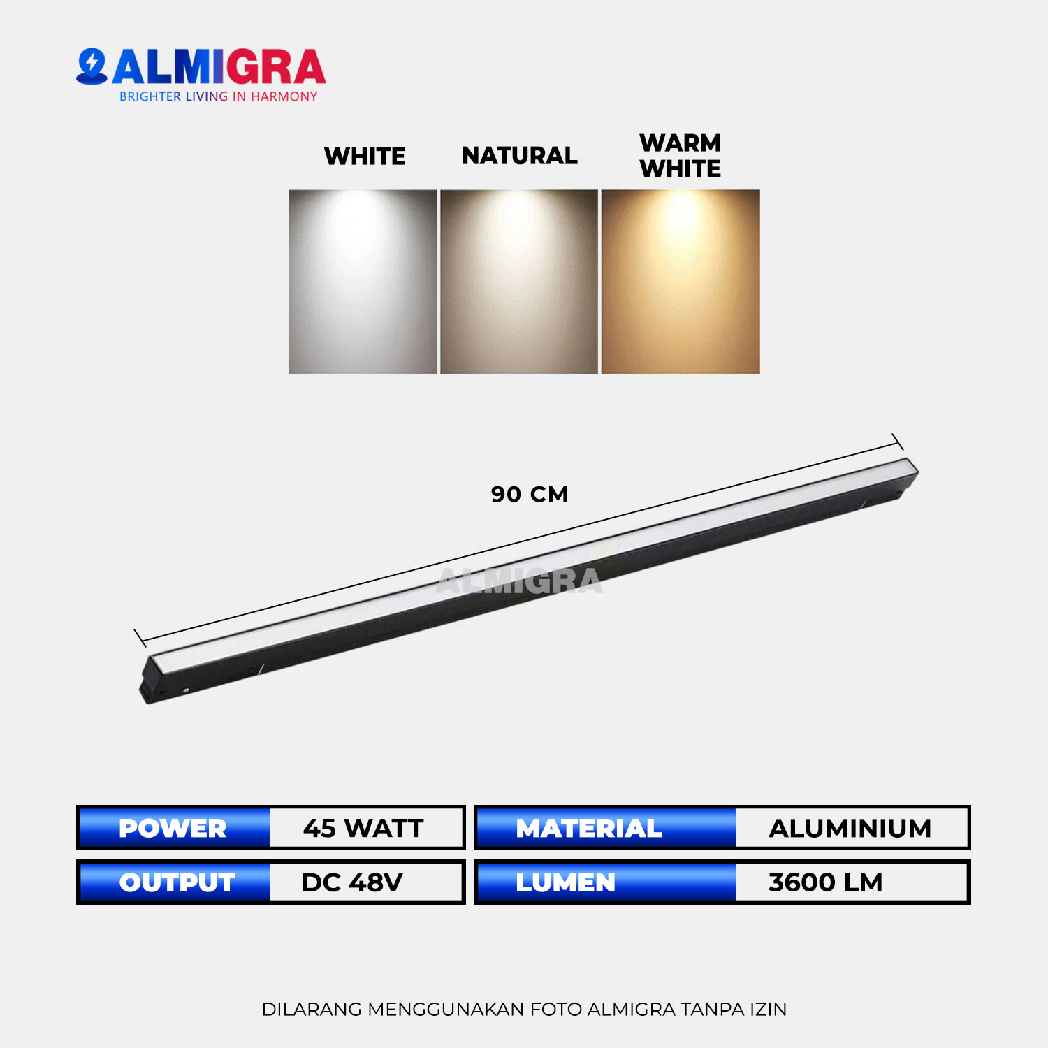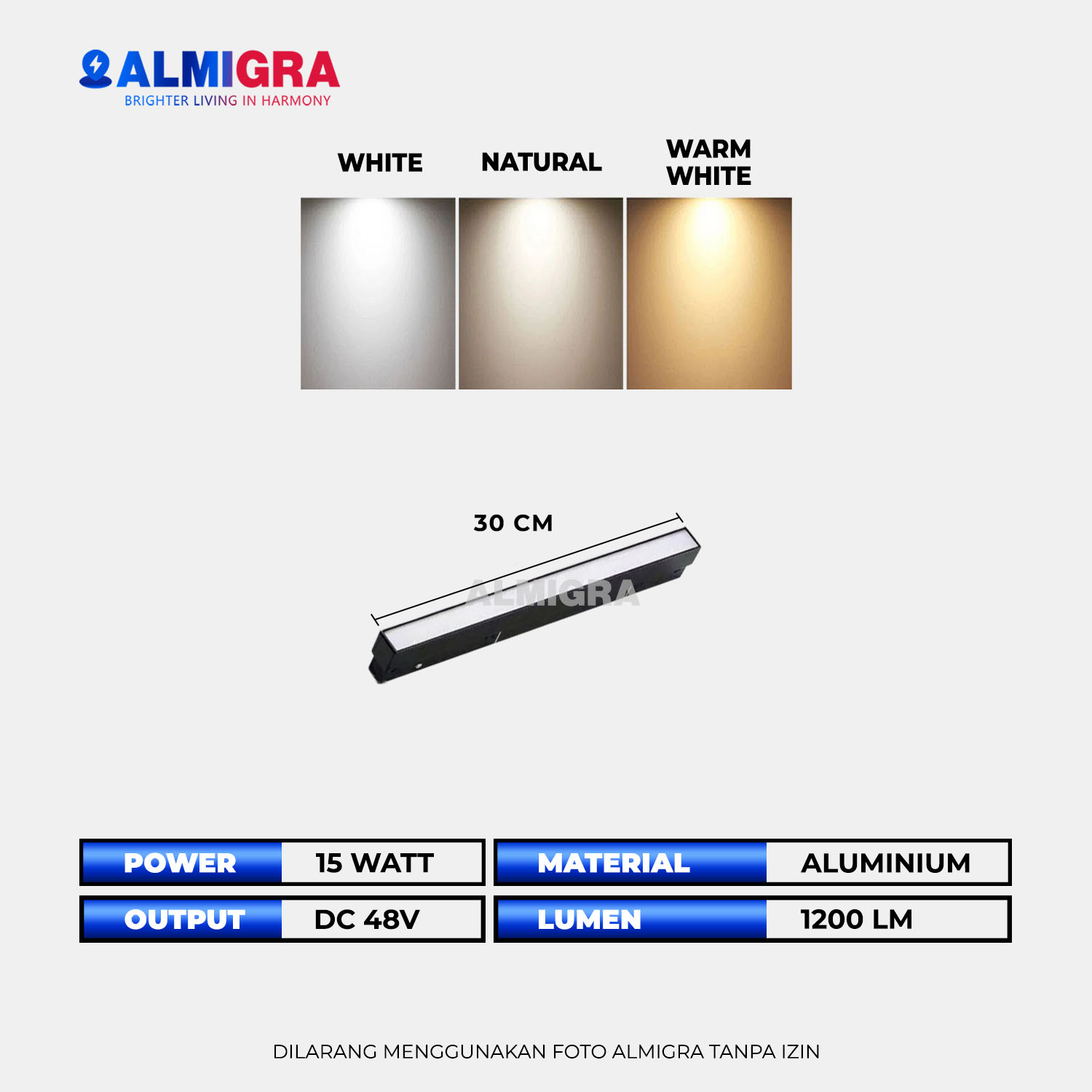 – Warna Cahaya: Warm White (3000K) / Natural (4000K) / Putih (6000K)
