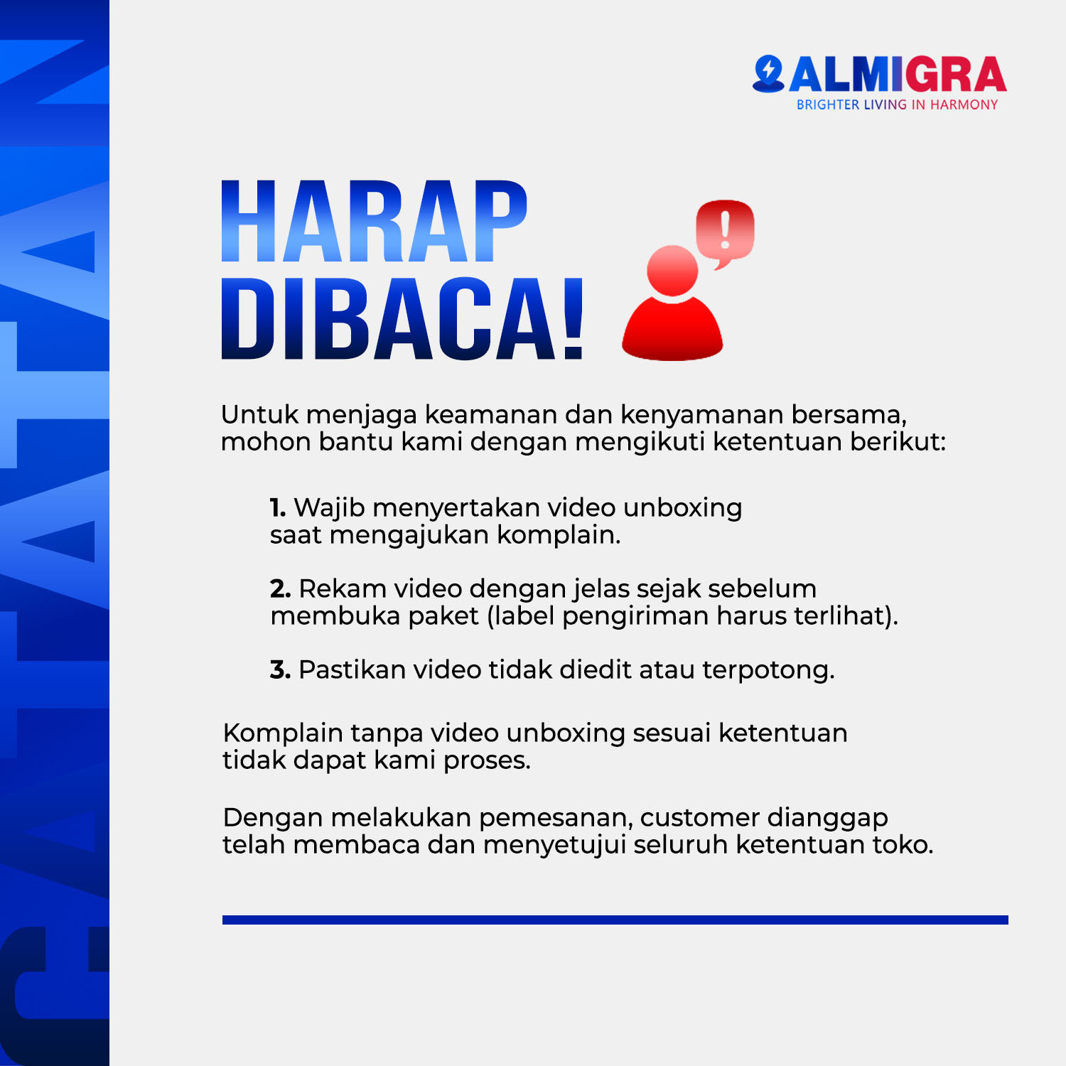 1. Demi kenyamanan bagi kedua pihak, wajib membuat video unboxing dengan label resi toko terlihat sebelum membuka paket hingga dites tanpa diedit atau terputus. Sehingga memudahkan jika terjadi kendala dan menghindari perdebatan. Tanpa video unboxing sesuai ketentuan kami tidak menerima komplain apapun.