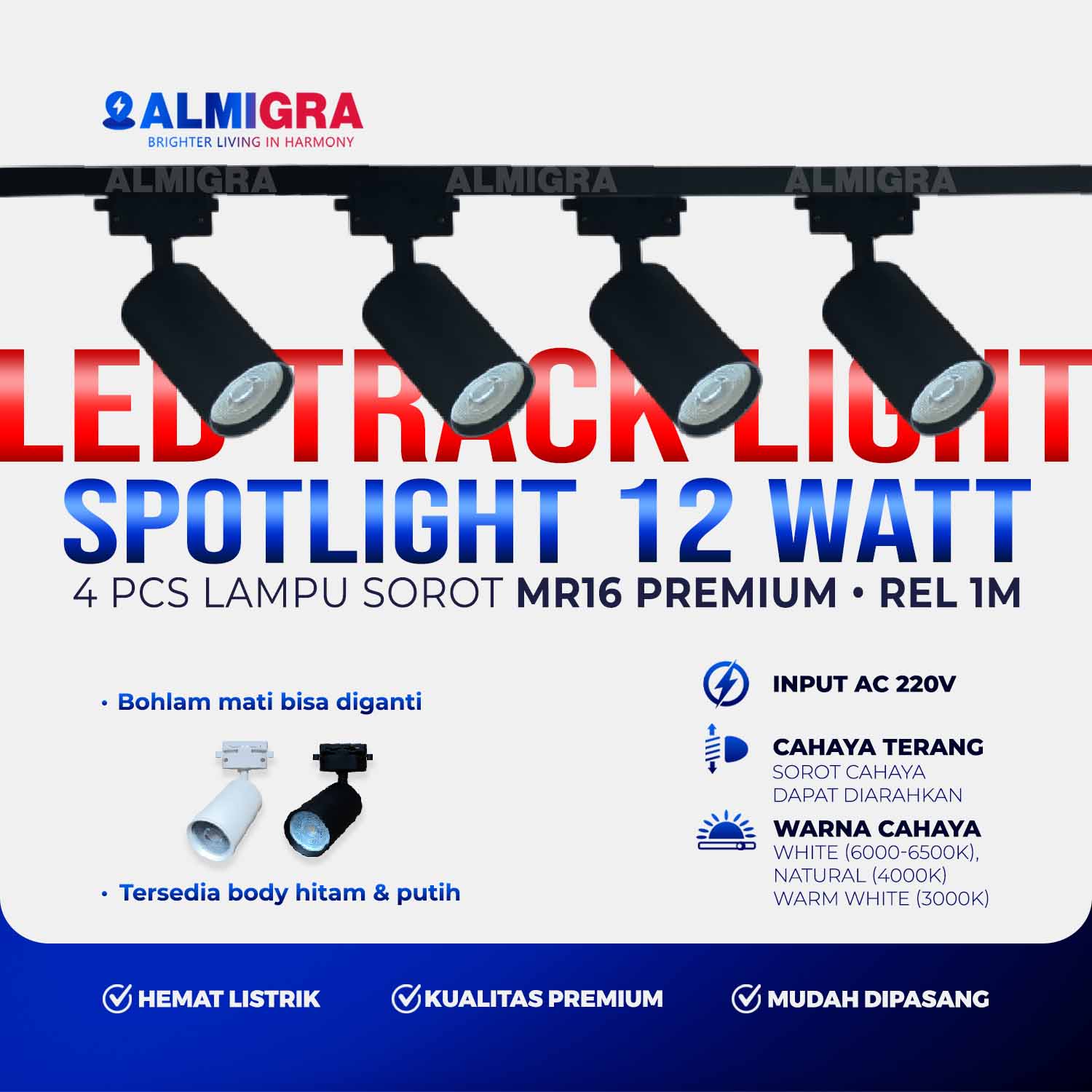 Set Rel Track 1 Meter 4 Lampu Sorot LED MR16 Premium 12W – Spotlight Track Light Plafon Bisa Ganti Bohlam